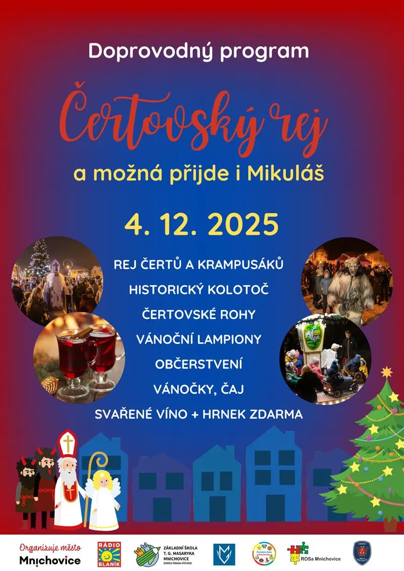 Ve čtvrtek 4. prosince od 16 hodin ožije prostor u mateřské školy v Mnichovicích čertovským rejem. Děti si nasadí masky, vezmou do ruky lampión nebo zvoneček a společně vyrazí směrem na Masarykovo náměstí.